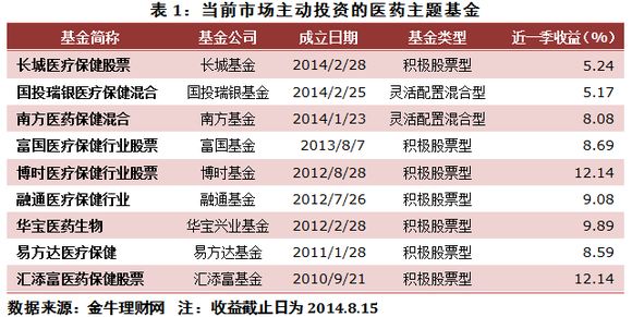 今年以來,盡管市場震蕩,成長股起伏,藍(lán)籌席卷,醫(yī)藥醫(yī)療主題基金卻始終能抗住風(fēng)浪,穩(wěn)健前行。進(jìn)入2014年,在政策大力扶植和行業(yè)基本面優(yōu)異的背景下,這一主題大家庭又新添了3位成員,分別為南方醫(yī)藥保健混合、國投瑞銀醫(yī)療保健混合、長城醫(yī)療保健股票。目前,市場上主動投資的醫(yī)藥醫(yī)療主題基金已達(dá)到9只。